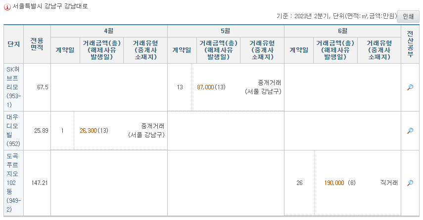 저는 예시로 강남구 강남대로에 주소를 둔 2023년 2분기에 실제 거래된 모든 아파트를 조회해 봤습니다.