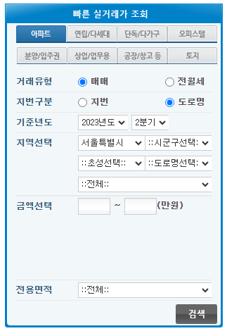 조회하려고 하는 항목 중 아파트, 거래유형, 지번구분, 기준연도와 지역선택의 도로명까지 선택하고 아래의 다른 항목은 그대로 두고 검색을 진행합니다.